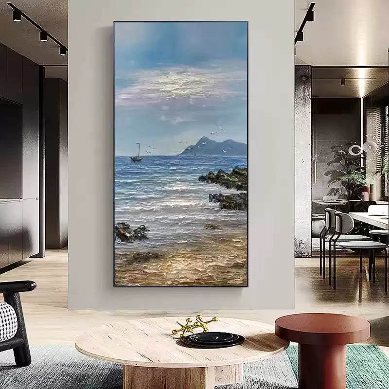 青く広がる海、穏やかな波、遠くに浮かぶ船と島。まるで本物の海辺にいるかのような、静かで落ち着いた雰囲気を醸し出す美しい風景画です。