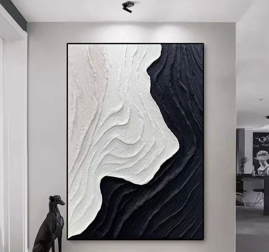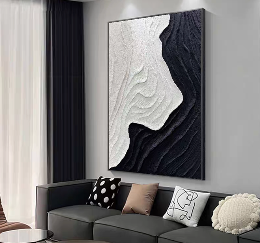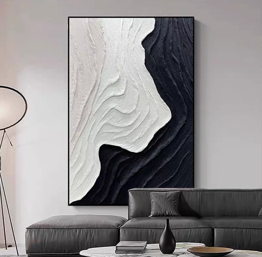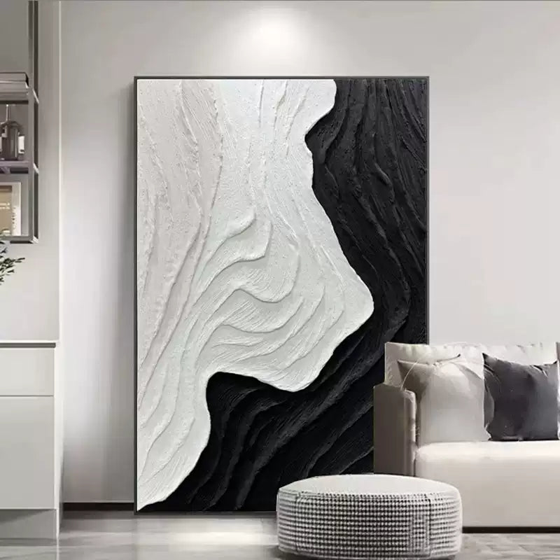 洗練されたモノクロのコントラストと、ダイナミックな立体テクスチャが特徴のモダンアートキャンバス。流れるようなラインが、自然の地層や砂丘を思わせる独創的なデザインです。