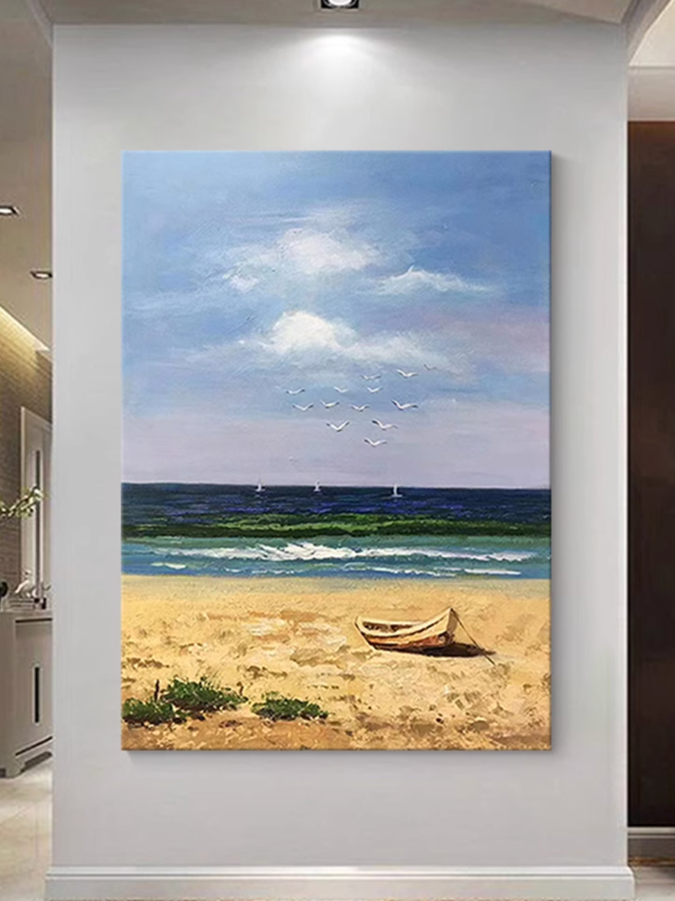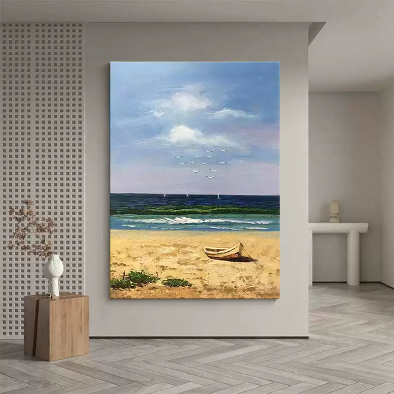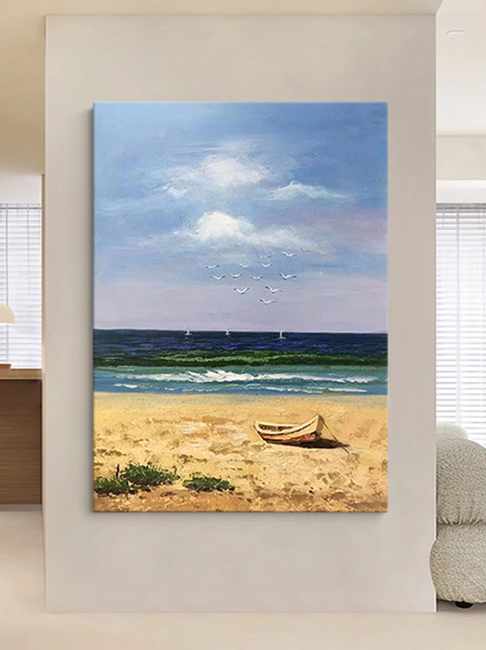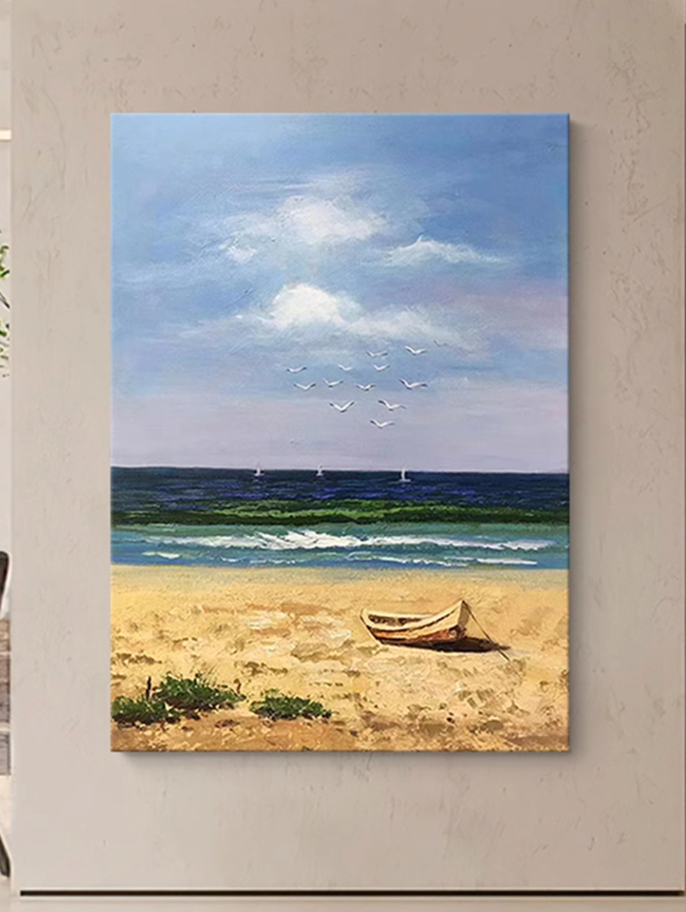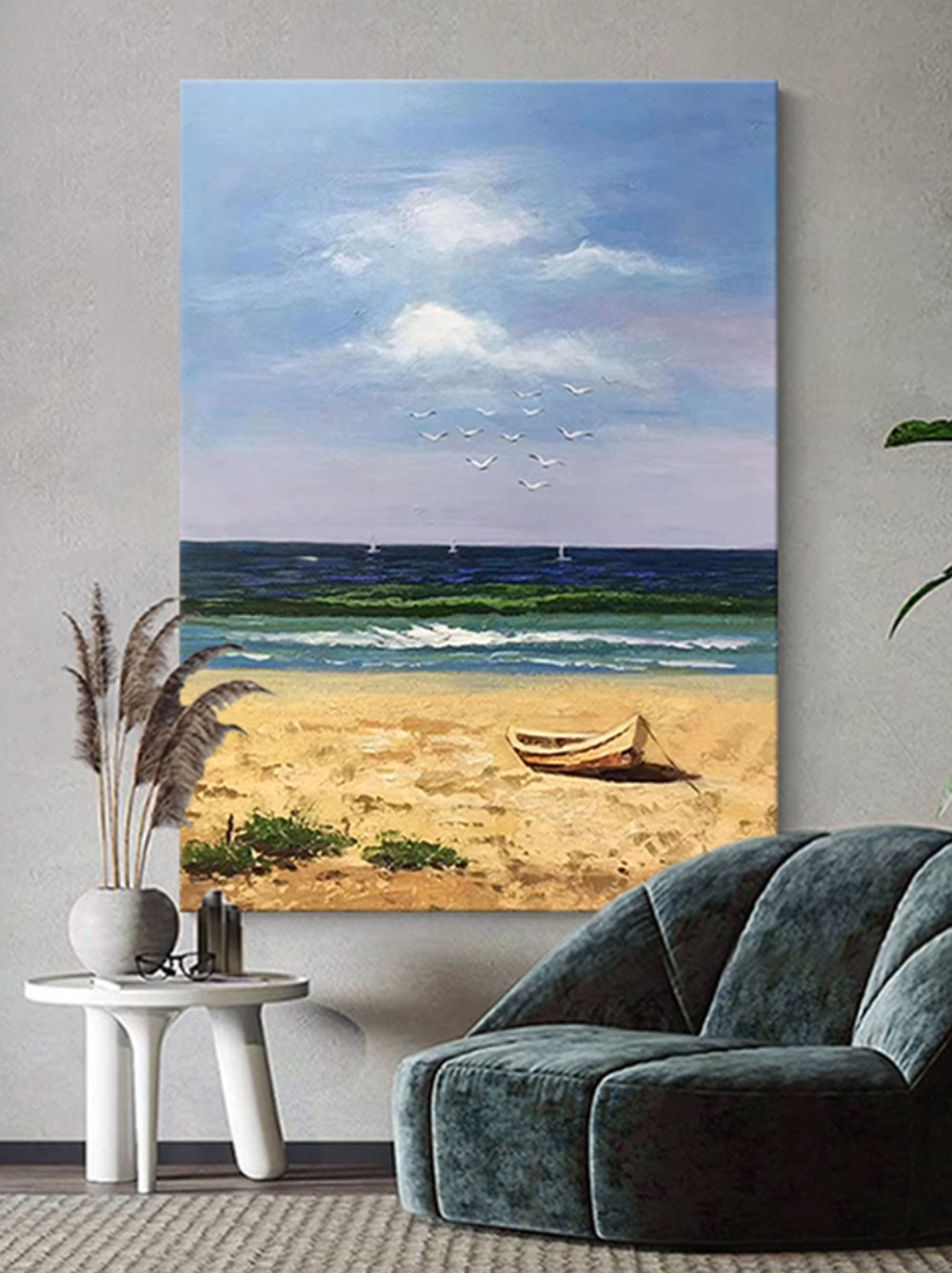 この美しいビーチサイドのキャンバスアートは、穏やかな波と広がる青空が印象的な一枚。遠くに浮かぶヨットや、砂浜に置かれた小舟がリラックスした雰囲気を演出し、まるで実際にビーチにいるかのような気持ちにさせてくれます。