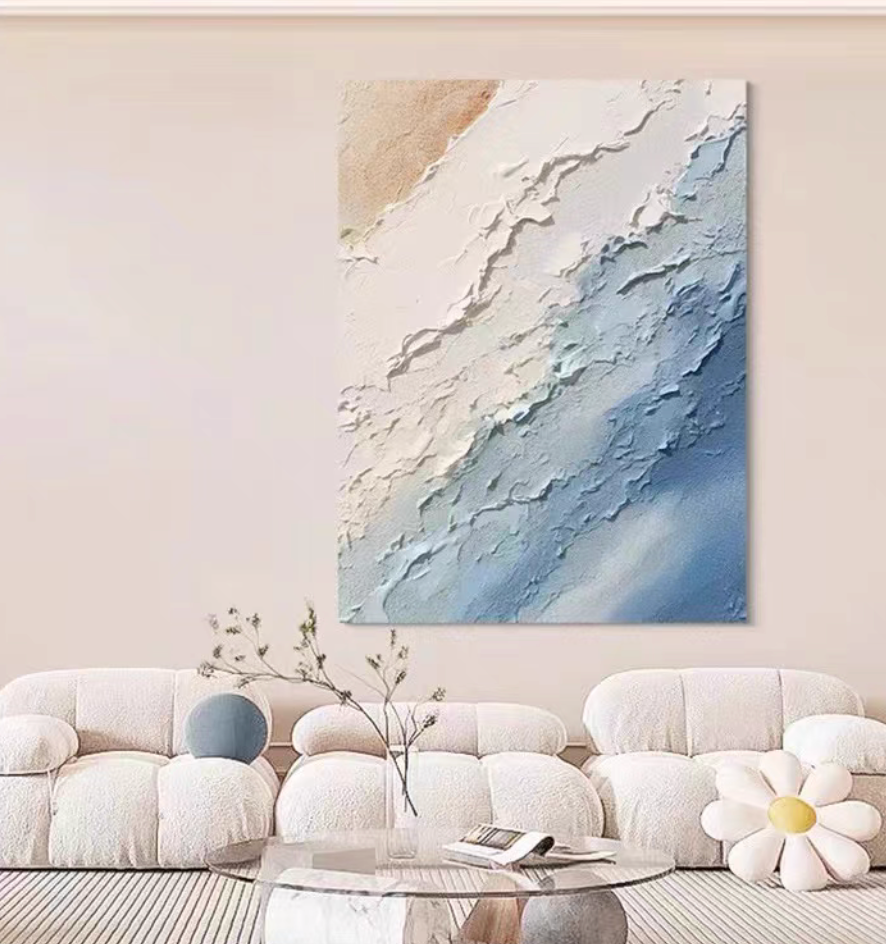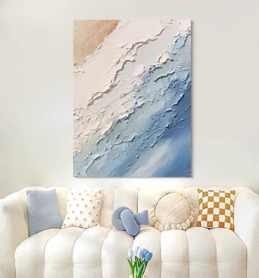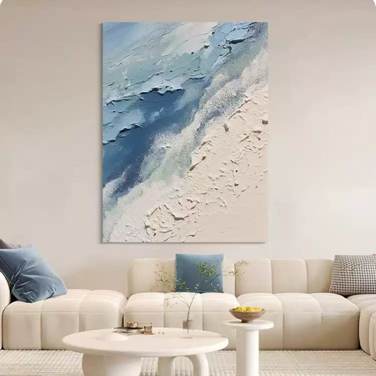 繊細なテクスチャと美しいグラデーションで表現された、爽やかな海辺の風景を描いたアート作品。波打ち際のリアルな質感と穏やかな色彩が、空間にリラックスした雰囲気をもたらします。海の穏やかさと美しさをインテリアに取り入れたい方におすすめの一枚です。