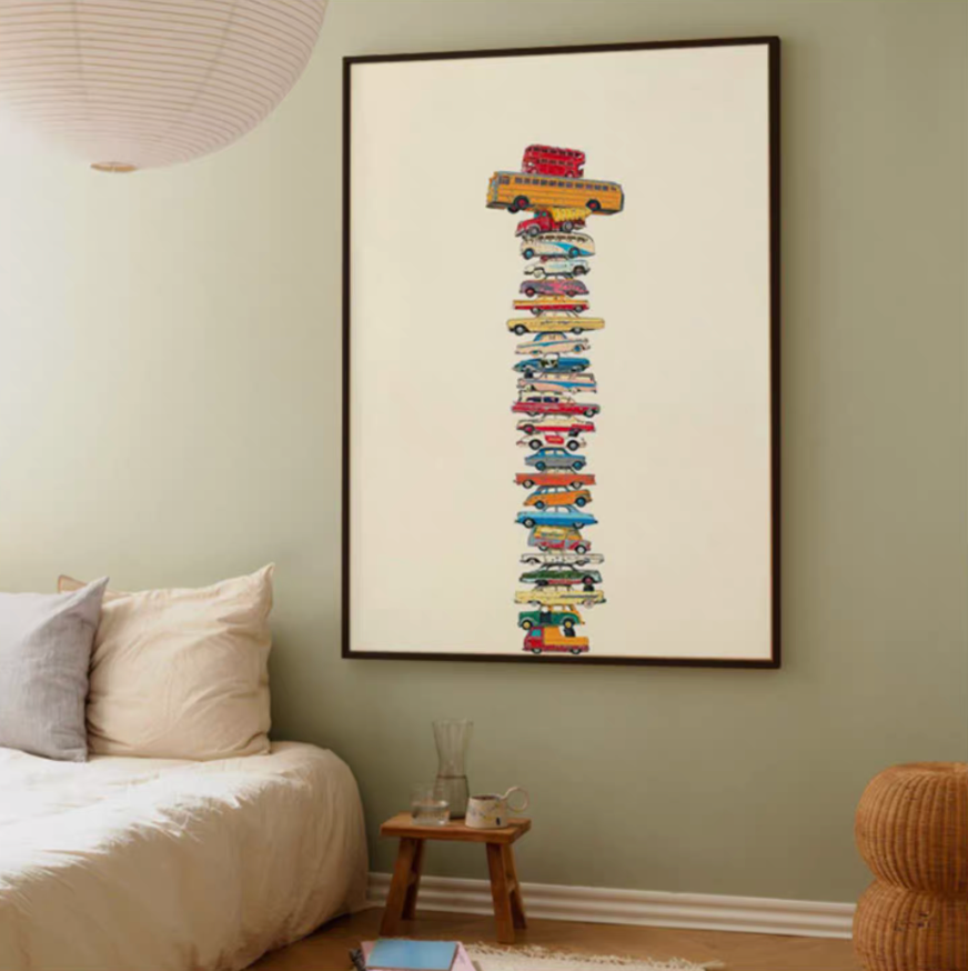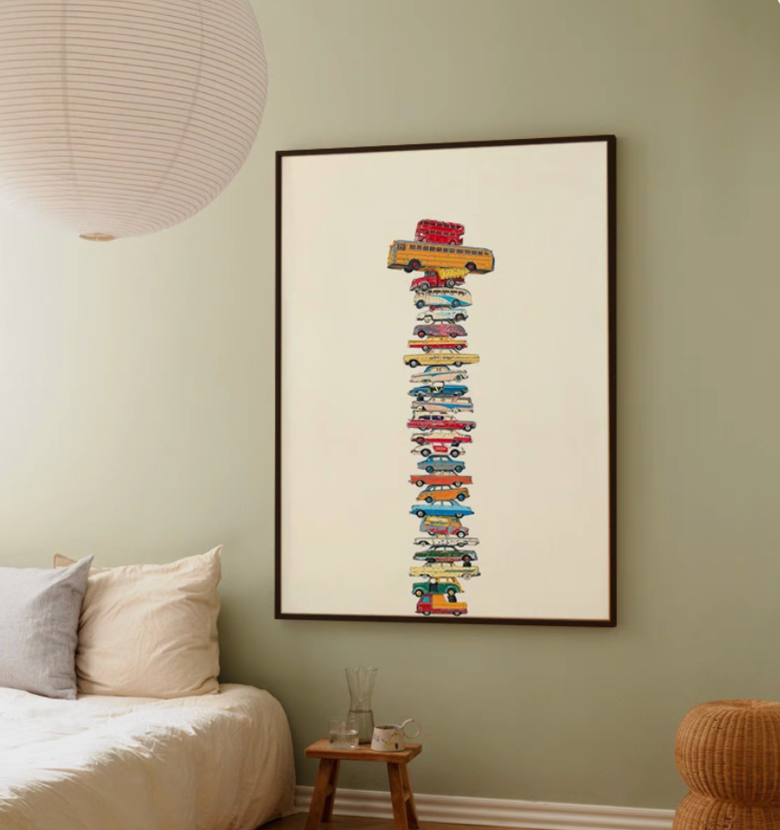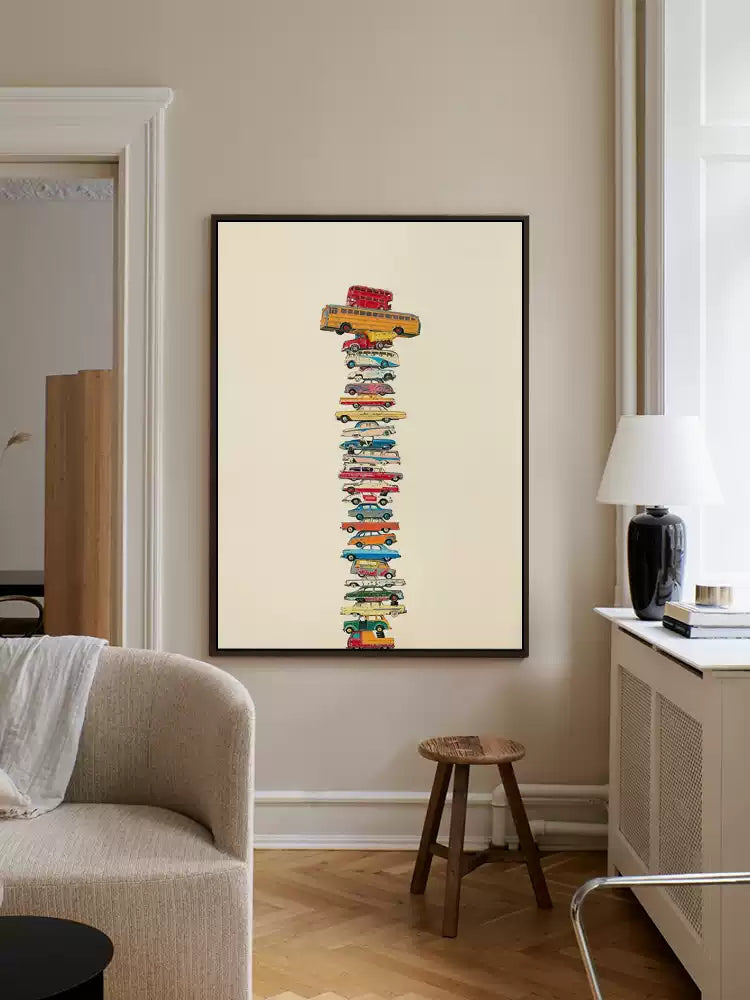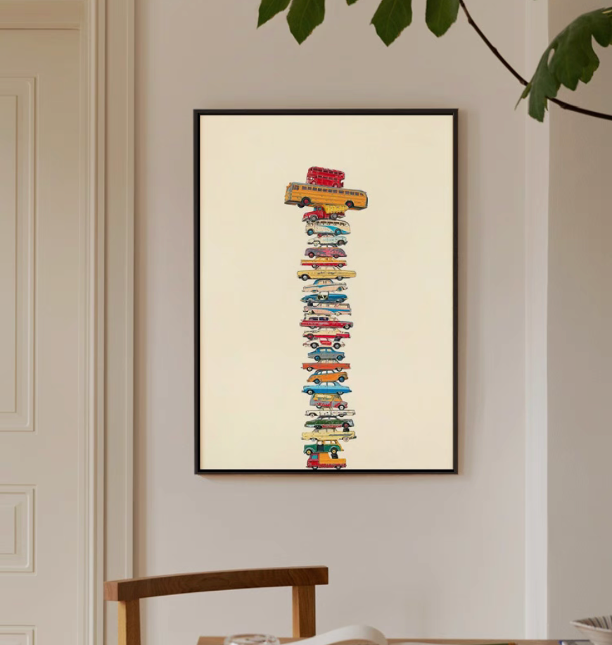 遊び心あふれるデザインとミニマルな背景が魅力のアート作品。レトロな雰囲気のカラフルな車たちがバランスよく積み重なり、ユーモラスで個性的なインテリアを演出します。車好きな方やユーモアのあるアートを楽しみたい方におすすめの一枚です。