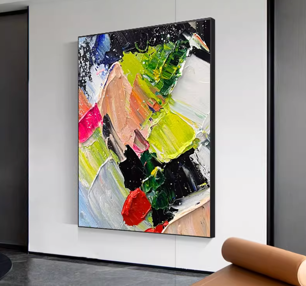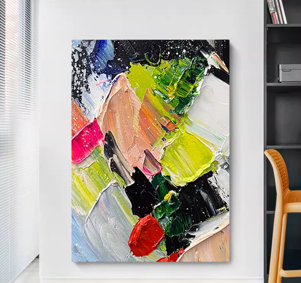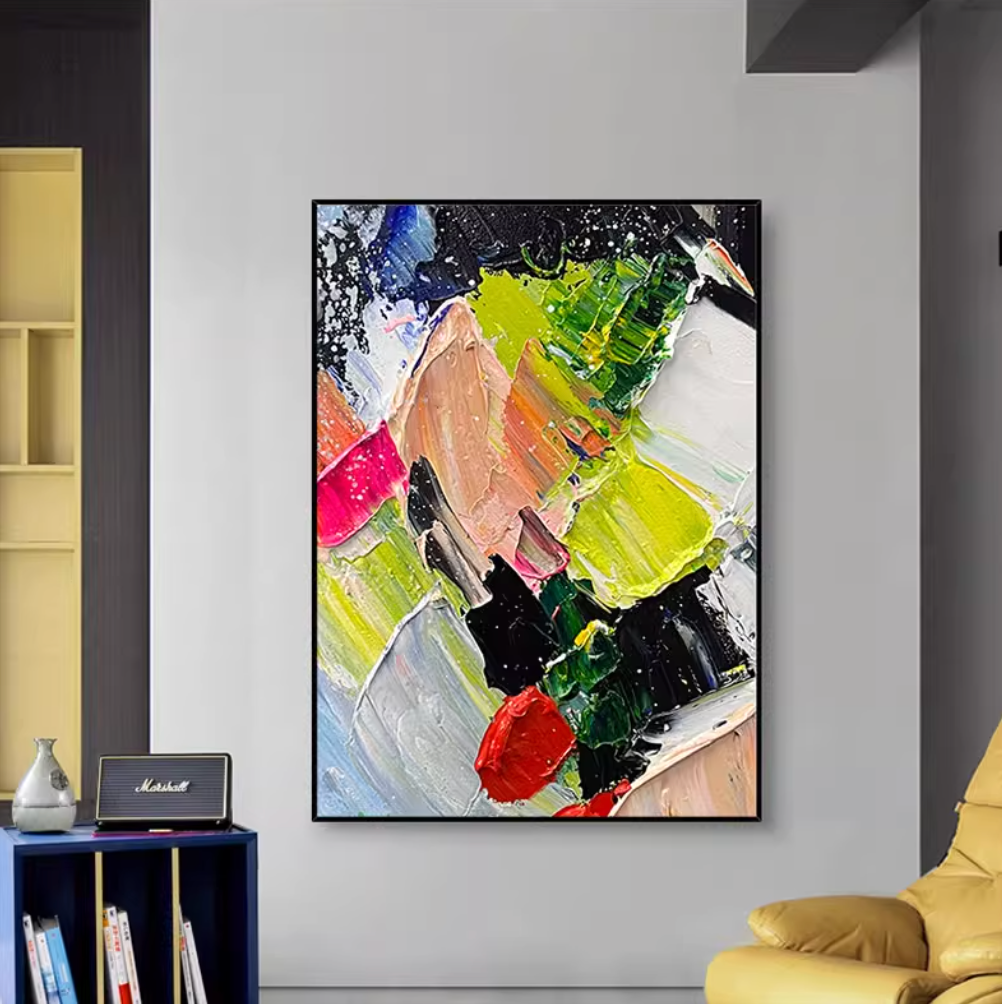 大胆な色使いと力強い筆づかいが魅力の抽象アート絵画。鮮やかなイエロー、レッド、グリーン、ブラックなど多彩なカラーが絶妙に絡み合い、エネルギッシュでダイナミックな印象を与えます。油絵風の厚塗りテクスチャが特徴で、見る角度によって異なる表情を楽しめる一枚です。