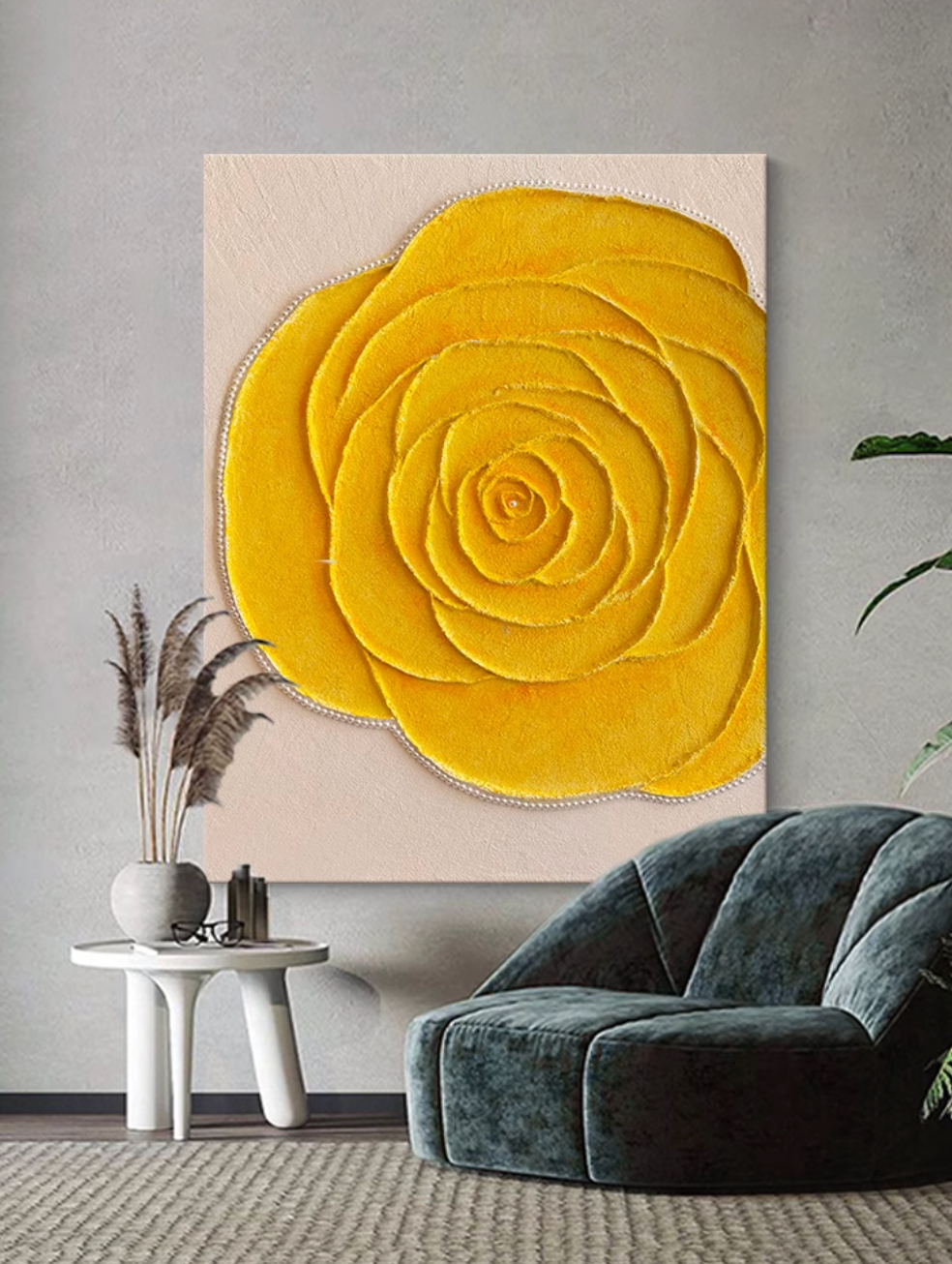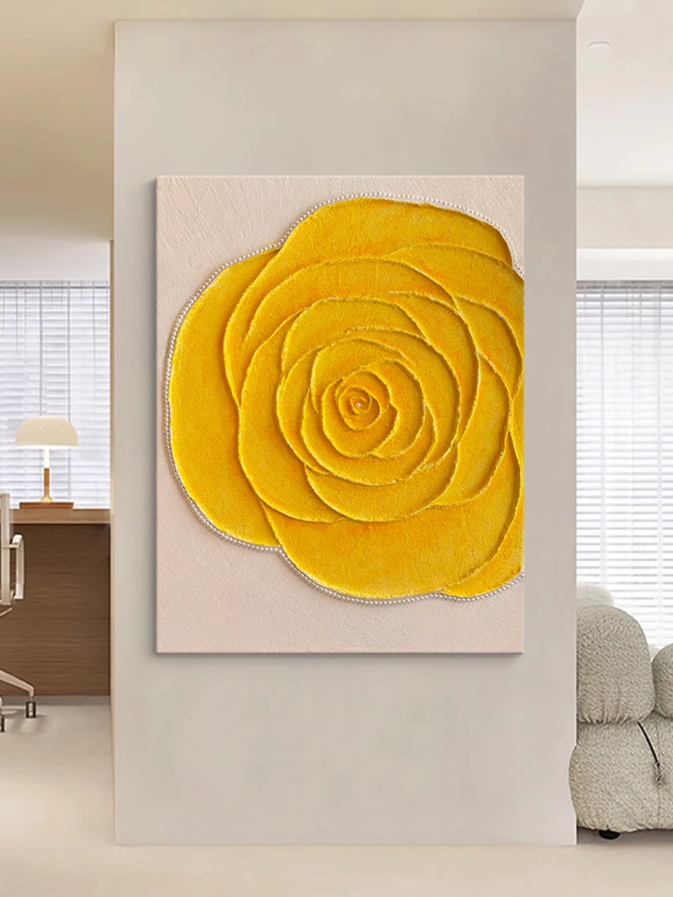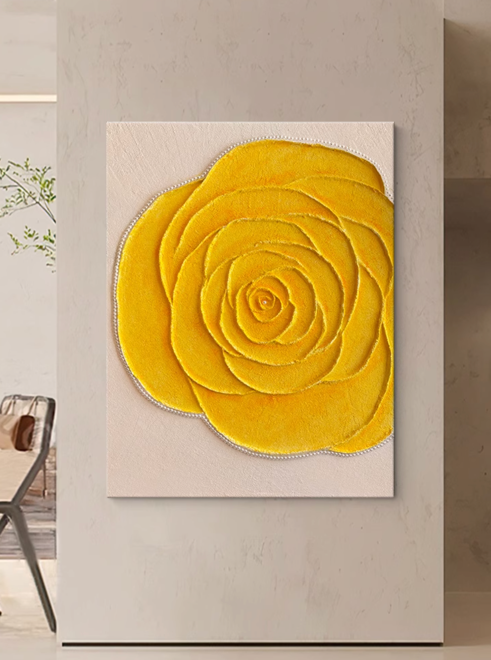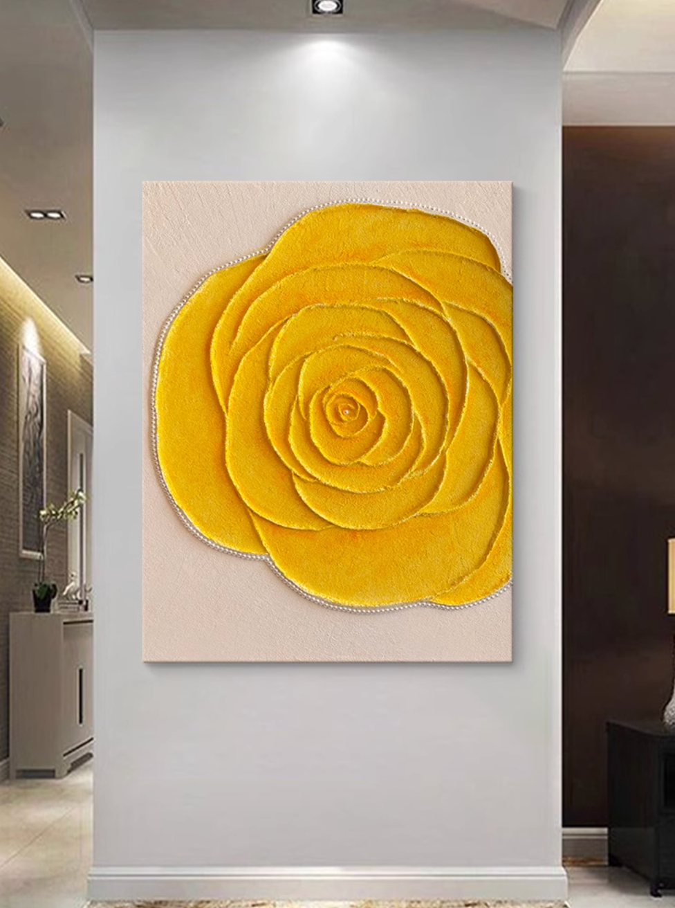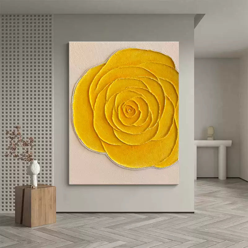 この美しいキャンバスアートは、鮮やかなイエローローズを立体的に表現したエレガントな一枚です。花びらの繊細なレイヤーと、リアルな質感が魅力的なデザインで、インテリアに明るさと温かみをプラスします。