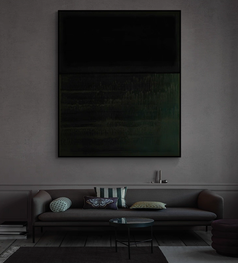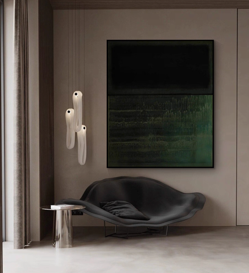 洗練されたダークカラーが特徴の、スタイリッシュなモダンアート作品。シンプルながらも深みのあるブラックとダークグリーンのグラデーションが、空間に洗練された高級感を演出します。